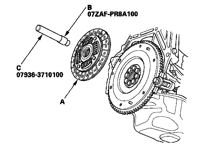 7. Remove the clutch disc (A), clutch alignment shaft (B), and remover handle (C).