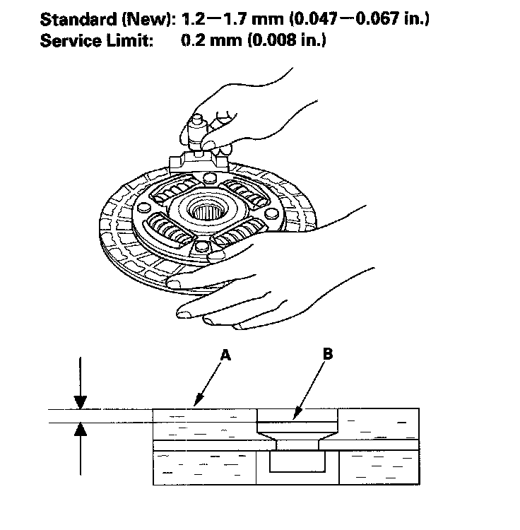 10. Measure the rivet depth from the clutch disc lining surface (A) to the rivets (B) on both sides. If the rivet depth is less than the service limit, replace the clutch disc.