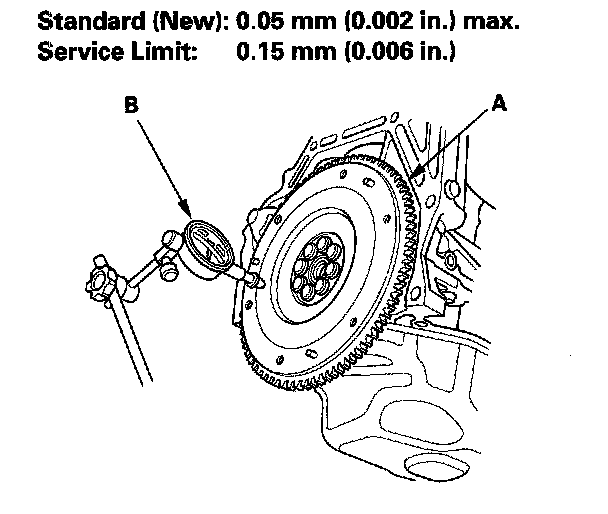 3. Measure the flywheel (A) runout using a dial indicator (B) through at least two full turns with the engine installed. Push against the flywheel each time you turn it to take up the crankshaft thrust washer clearance. If the runout is more than the service limit, replace the flywheel, and recheck the runout. Resurfacing the flywheel is not recommended.