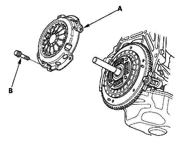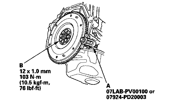 4. Install the ring gear holder (A), then torque the flywheel mounting bolts (B) in a crisscross pattern in several steps.