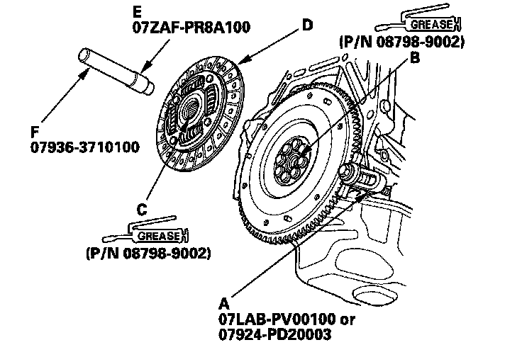 4. Apply super high temp urea grease (P/N 08798-9002) to the splines (C) of the clutch disc (D), then install the clutch disc using the clutch alignment shaft (E) and remover handle (F).