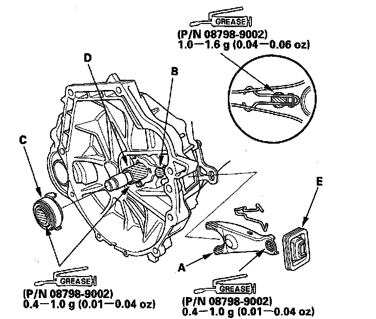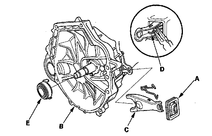 2. Remove the release fork (C) from the clutch housing by squeezing the release fork set spring (D) with pliers. Remove the release bearing (E).