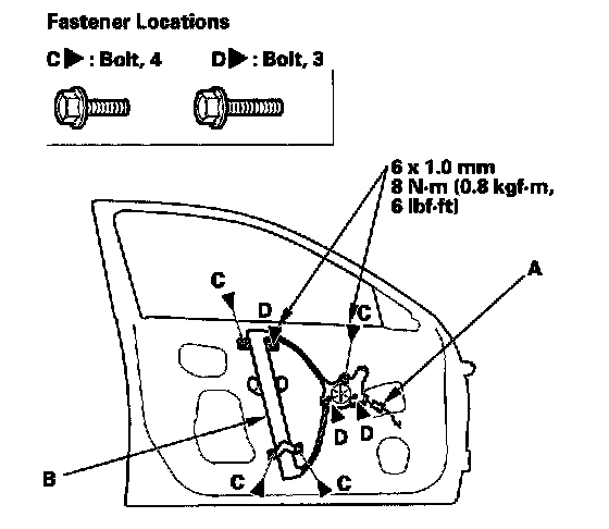 6. Remove the bolts (C), and loosen the bolts (D), then remove the regulator through the hole in the door.