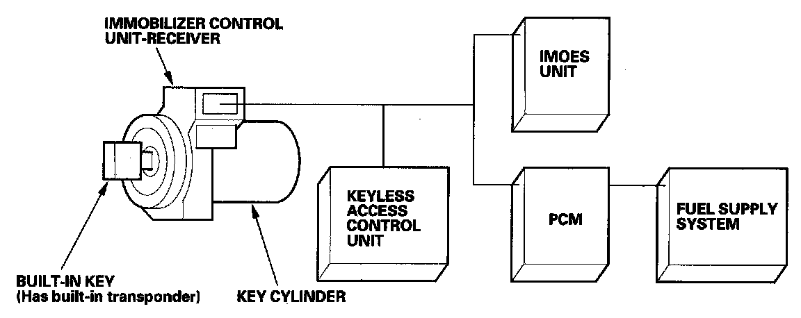 When the built-in key is inserted in the ignition switch and turned to the ON (II) position, the immobilizer control unit-receiver sends power to the transponder in the built-in key. The transponder then sends a coded signal back to the immobilizer control unit-receiver which then sends a coded signal to the PCM and the imoes unit. The PCM and the imoes unit identify this coded signal, then the fuel supply system is enabled.
