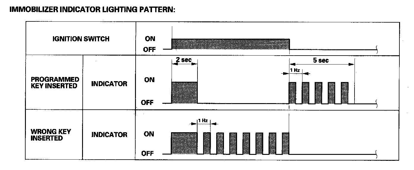 - If the proper key or remote has been used, the immobilizer indicator will come on for about 2 seconds, then go off. When the ignition switch is turned OFF, the indicator will blink for about 5 seconds to signal that the unit has reset correctly, then the indicator will go off.