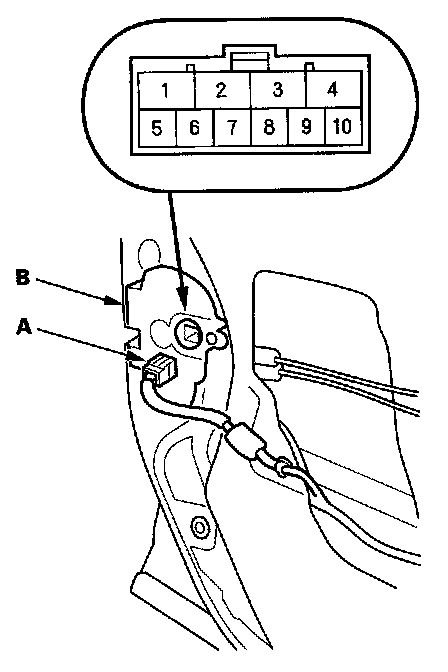 2. Disconnect the 10P connector (A) from the key cylinder switch (B).