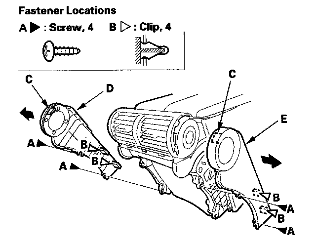 3. Remove the screws (A) and detach the clips (B) and hooks (C), then remove the left console side trim (D) and right console side trim (E).