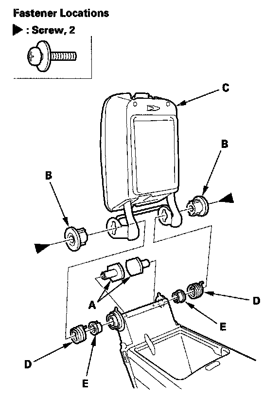 5. Remove the screws, hinge bushings (A), and hinge stoppers (B) from both sides, then remove the console armrest (C).