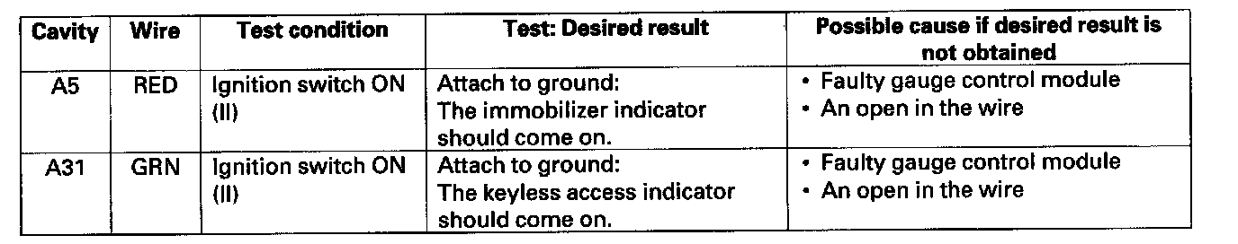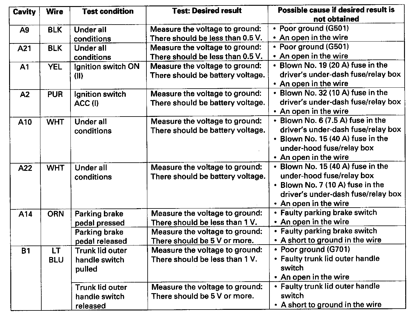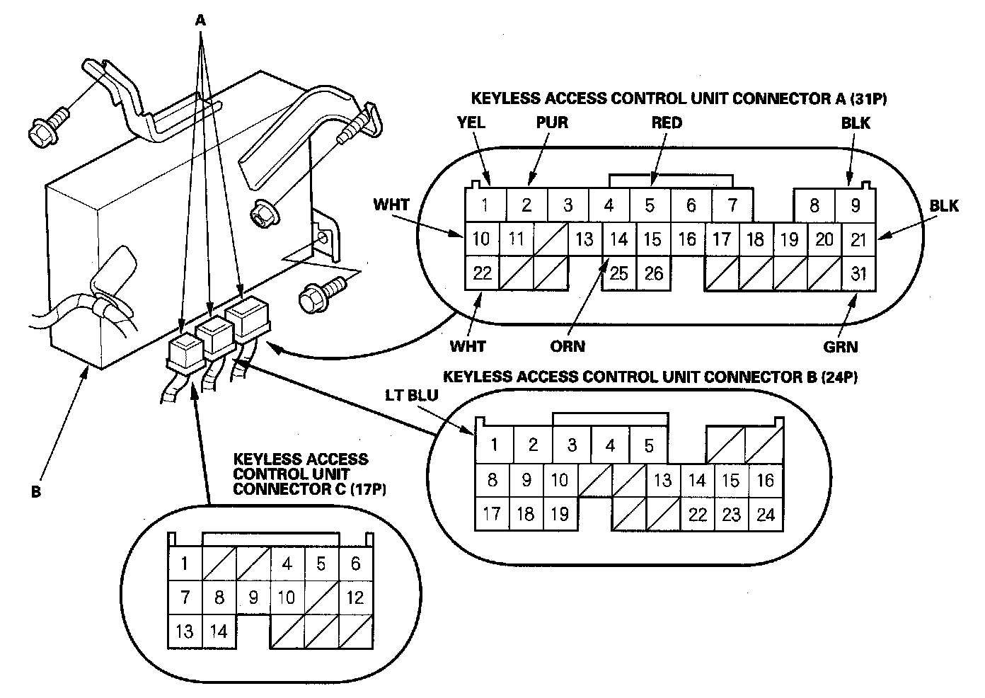 6. Reconnect the connectors to the keyless access control unit, and make these input tests at the connectors.
