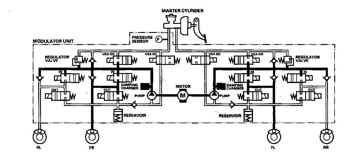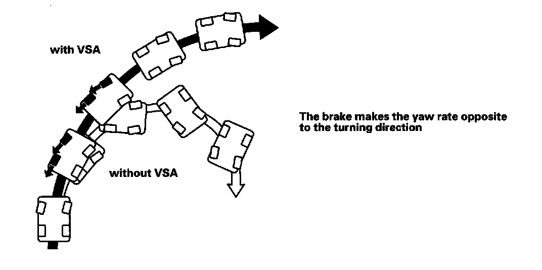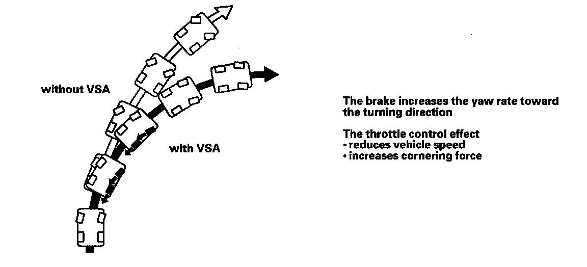 Under hard braking conditions, the VSA modulator-control unit monitors wheel speed in order to allow a maximum amount of brake distribution individually to the rear wheels. Once the VSA modulator-control unit detects that one or both rear wheels are nearing their maximum braking potential, the inlet valve closes for one or both rear wheels, maintaining the current pressure. If the traction is improved, and the wheel(s) is no longer nearing its limits, the VSA modulator-control unit will open the inlet solenoid allowing additional pressure to be distributed to the rear wheel. The rear wheels are controlled independently of each other during EBD function.