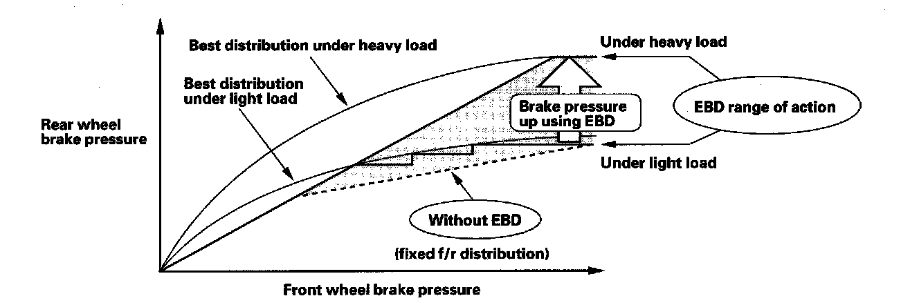 When the vehicle is heavily loaded, most of the increase in weight is born by the rear wheels, increasing braking capability. Proportioning valves maintain a fixed distribution of brake pressure between the front and the rear wheels, making it very difficult to fully utilize increased rear wheel braking capability. EBD varies brake pressure distribution according to load, using input from the wheel speed sensors, which improves overall braking performance.