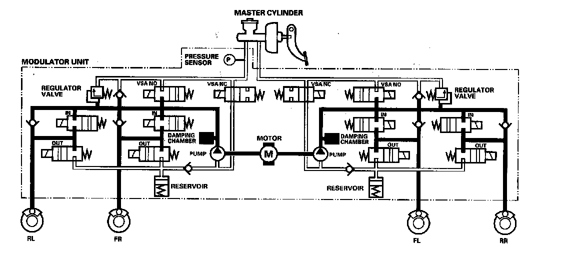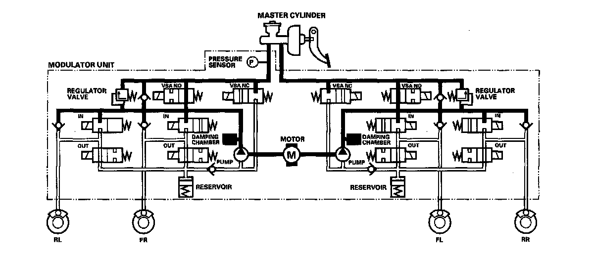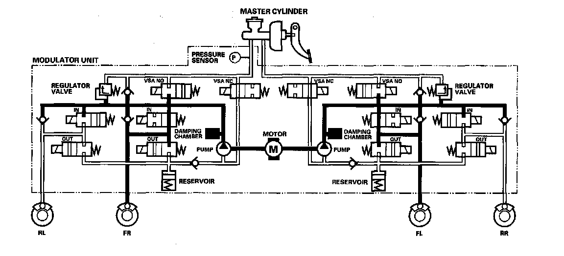 The reservoir and master cylinder fluid is pumped out by the pump, through the damping chamber, to the front and rear calipers.