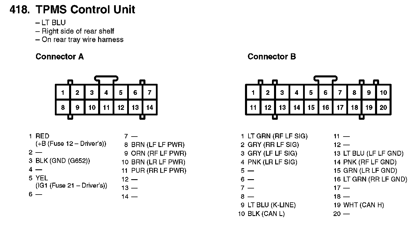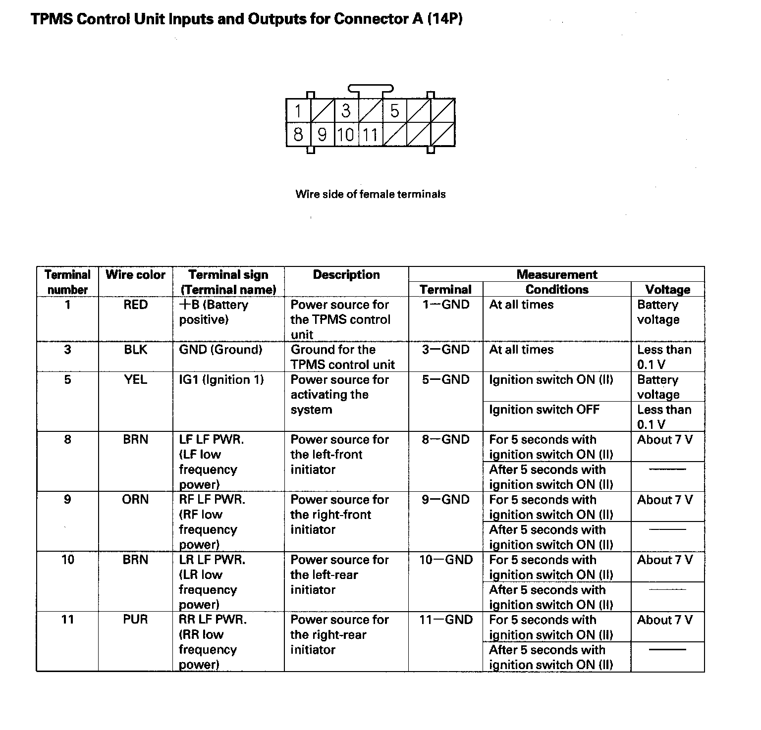 TPMS Control Unit Inputs and Outputs for Connector A (14P):