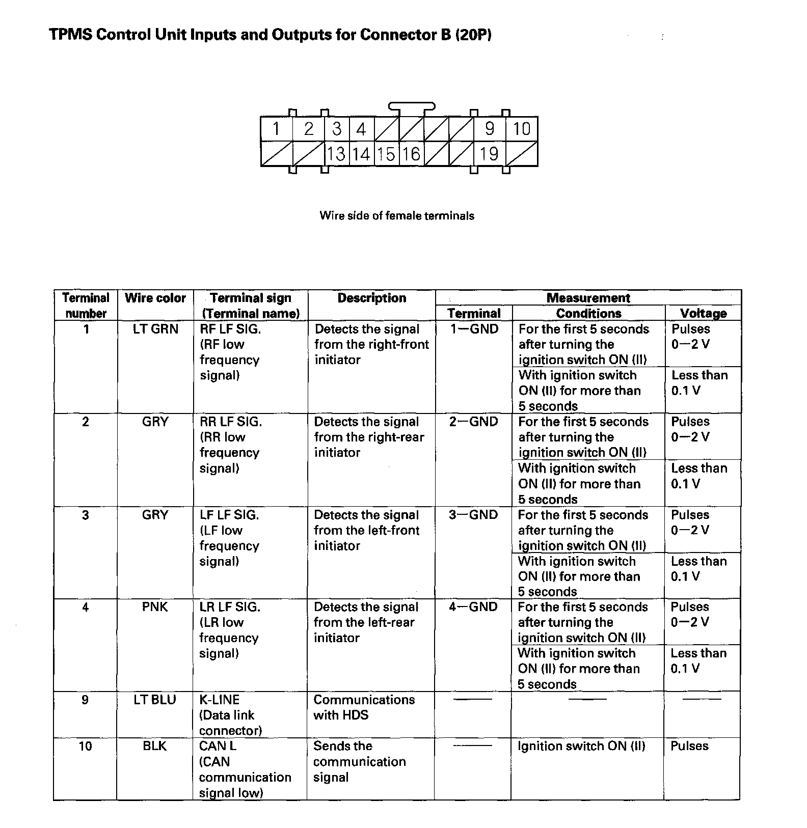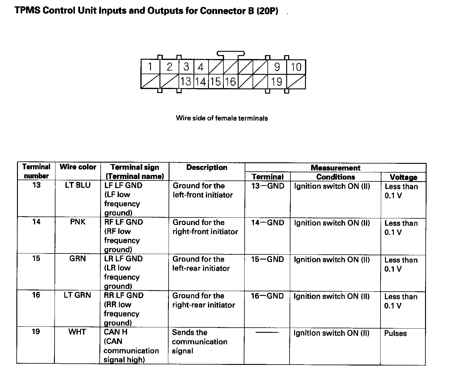 TPMS Control Unit Inputs and Outputs for Connector B (20P) (Part 1):