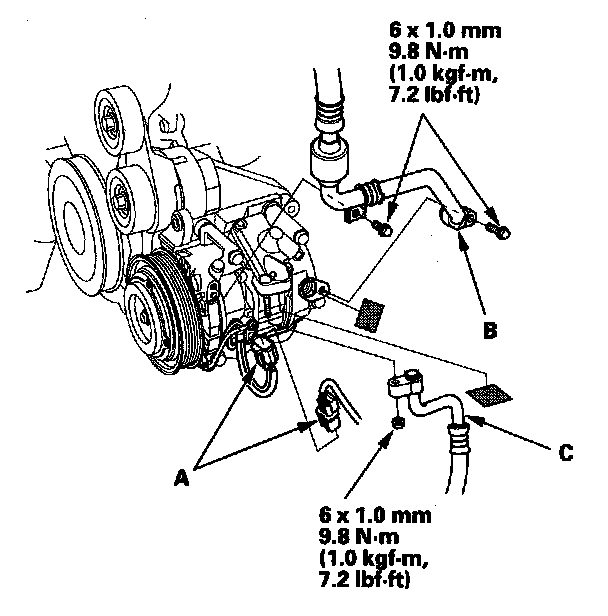 7. Disconnect the A/C compressor clutch connector (A). Remove the bolts and the nuts, then disconnect the suction hose (B) and discharge hose (C) from the A/C compressor. Plug or cap the lines immediately after disconnecting them to avoid moisture and dust contamination.