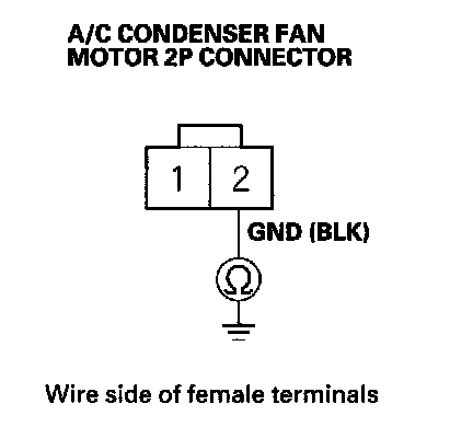2. Check for continuity between A/C condenser fan motor 2P connector terminal No. 2 and body ground.