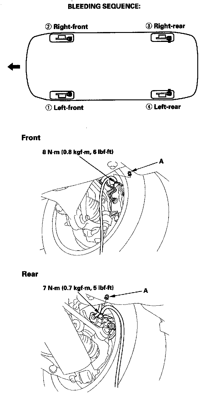 NOTE: The front and rear bleed screw caps (A) are different. Make sure to install them in the proper position.