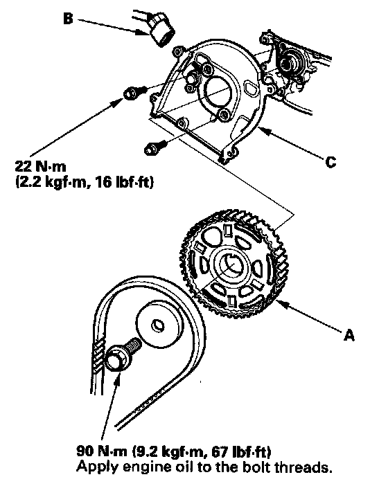 6. Disconnect the CMP sensor connector (B), then remove the back cover (C).