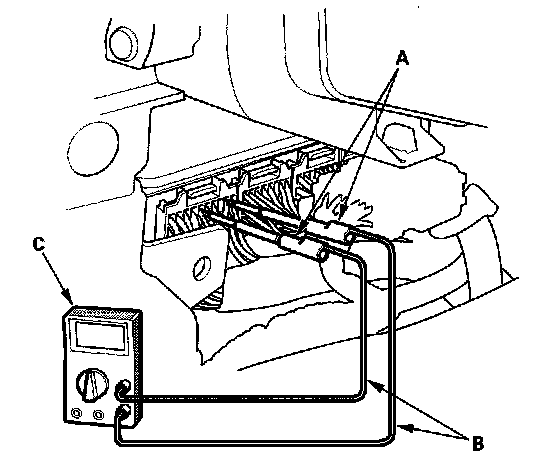 1. Connect the backprobe adapters (A) to the stacking patch cords (B), and connect the cords to a digital multimeter (C).
