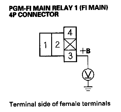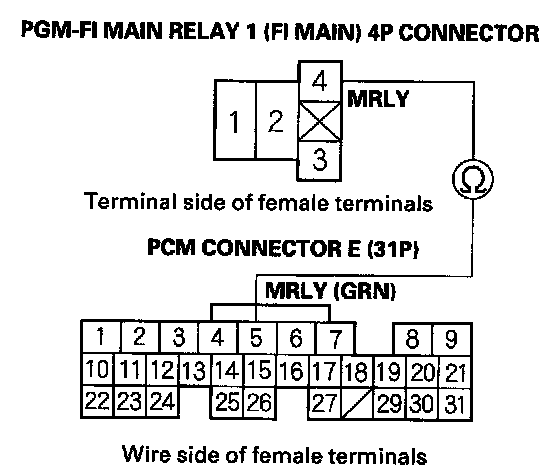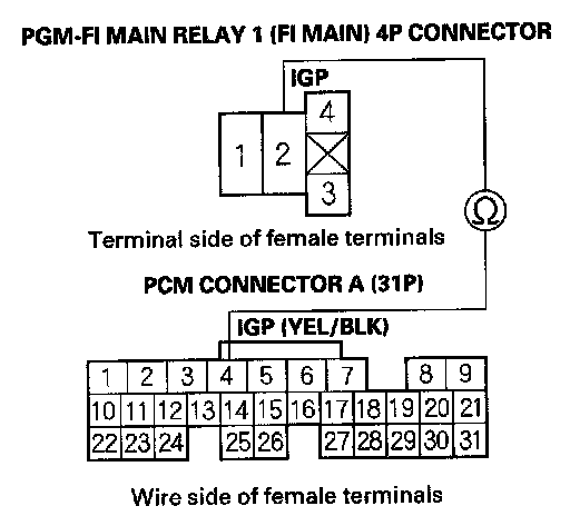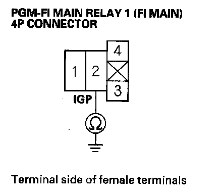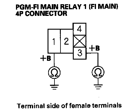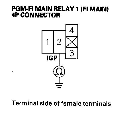 27. Check for continuity between body ground and PGM-FI main relay 1 (FI MAIN) 4P connector terminals No. 1 and No. 3 individually.