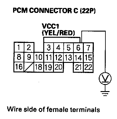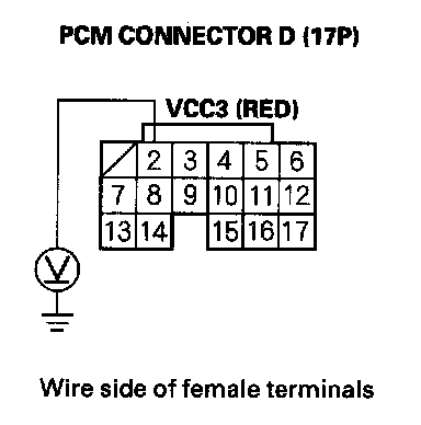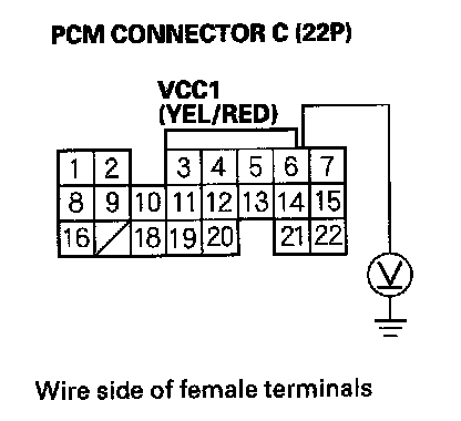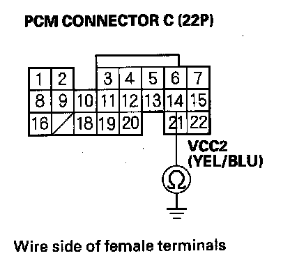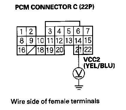 61. Disconnect the connector from each of the following sensors, one at a time, while measuring voltage between body ground and PCM connector terminal C14 with the ignition switch ON (II).
