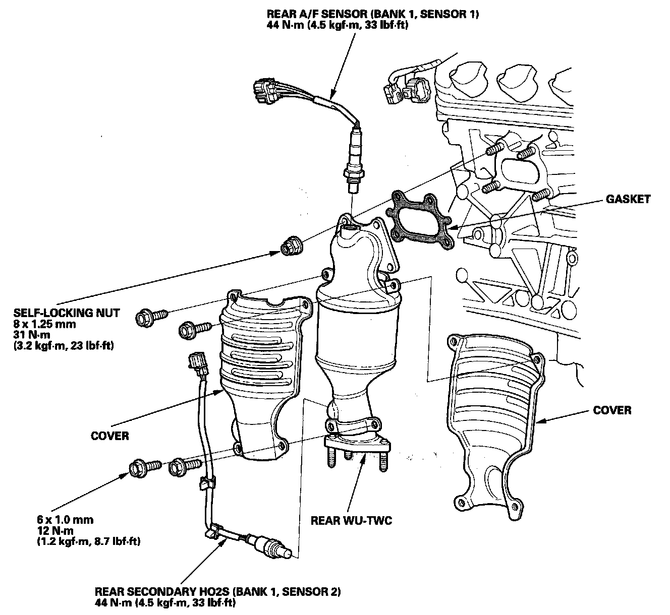 2. Disconnect the rear air fuel ratio (A/F) sensor connector and rear secondary heated oxygen sensor (secondary HO2S) connector.