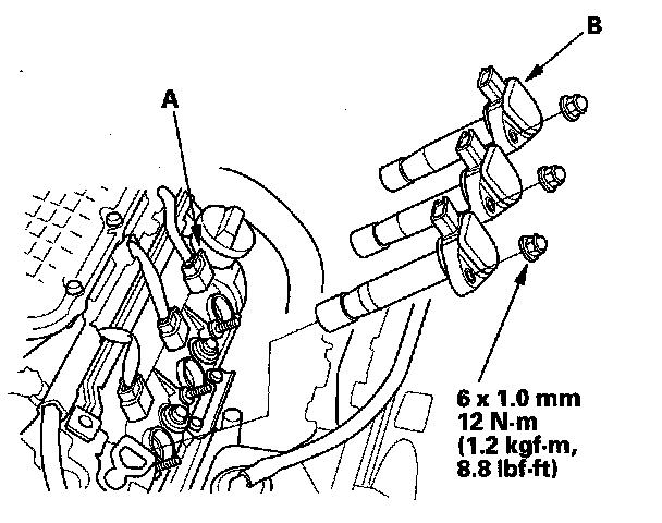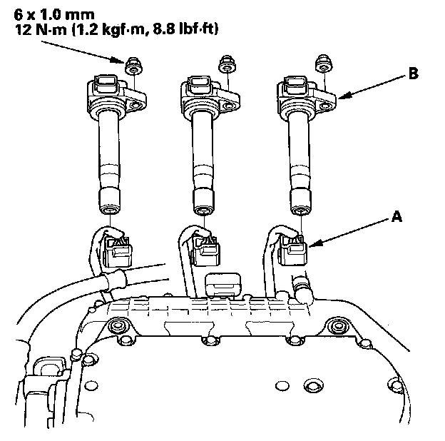 2. Disconnect the ignition coil connectors (A), then remove the front bank ignition coils (B).