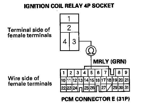 NO - Repair open in the wire between ignition coil relay 4P socket terminal No. 3 and the PCM (E5).