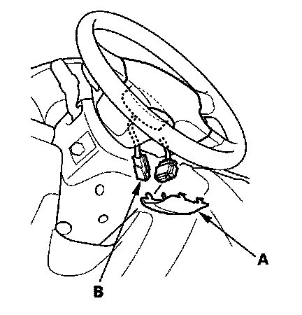 4. Remove the access panel (A) from the steering wheel, then disconnect the driver's airbag 4P connector (B) from the cable reel.
