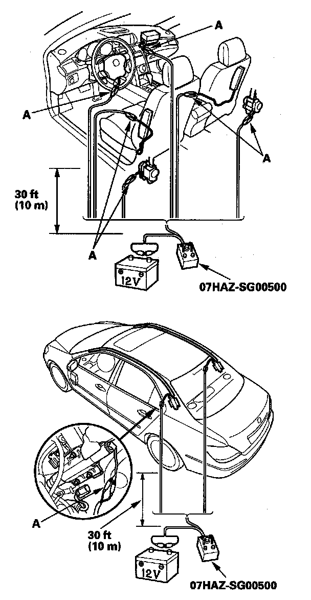 9. Cut off each connector, strip the ends of the wires, and connect the deployment tool alligator clips (A) to the wires. Place the deployment tool at least 30 feet (10 meters) away from the vehicle.
