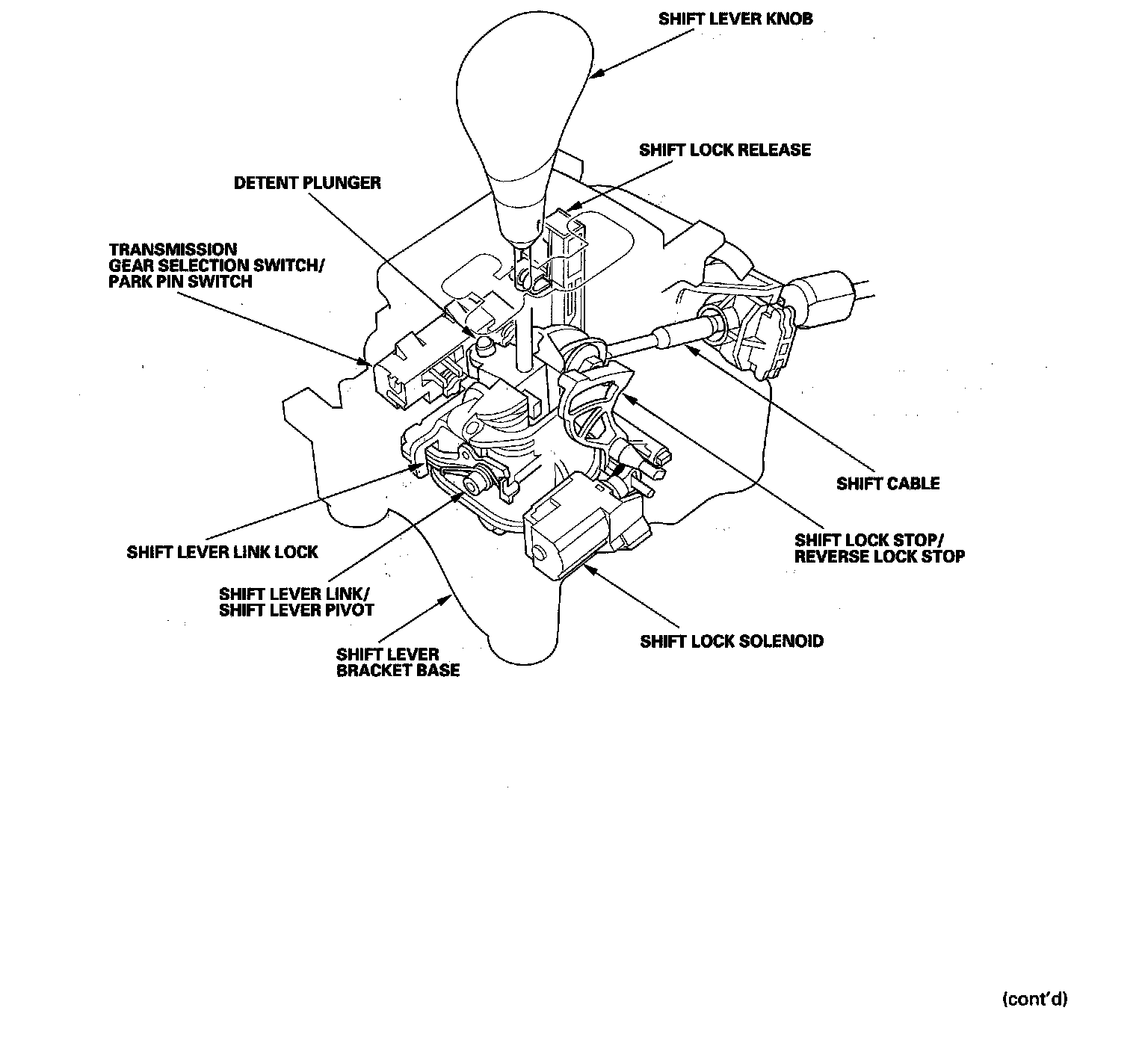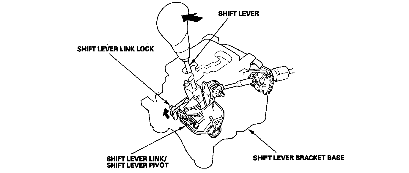 Shift Lever MechanismThe shift lever has five positions; P, R, N, D, and D3. D has two modes; automatic shift mode and sequential shift mode with the shift lever moved to M. The shift lever movement and position is indicated by the A/T gear position indicator panel. The shift lock/reverse lock mechanism is an additional shift lever lockout mechanism; the shift lever can be shifted out of P and into R without pressing the shift lever. The shift lever is engaged with the shift lever link in P, R, N, D, and D3. This unit shifts the transmission using the shift cable connected between the shift cable link and the transmission control shaft.