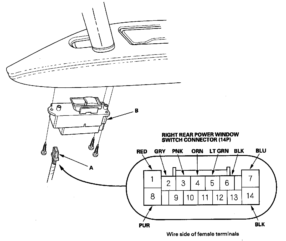 3. Disconnect the 14P connector (A) from the right rear power window switch (B).