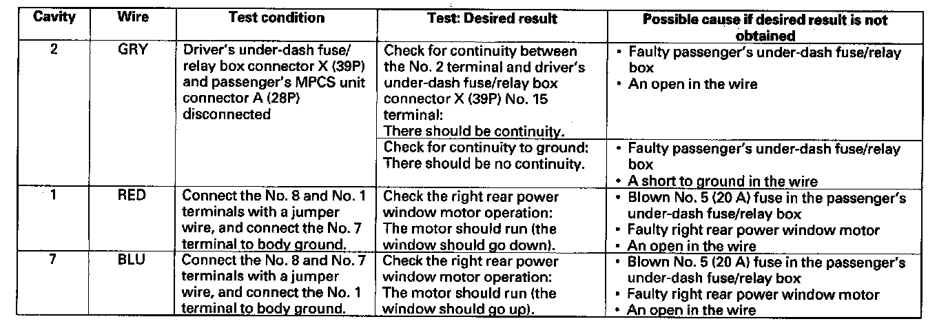 - If all the input tests prove OK, the right rear power window switch must be faulty; replace it and go to step 7.