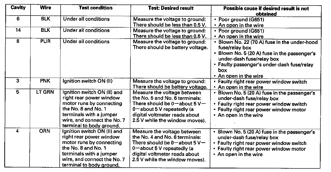 6. Reconnect the connector to the right rear power window switch, and make these input tests at the connector.