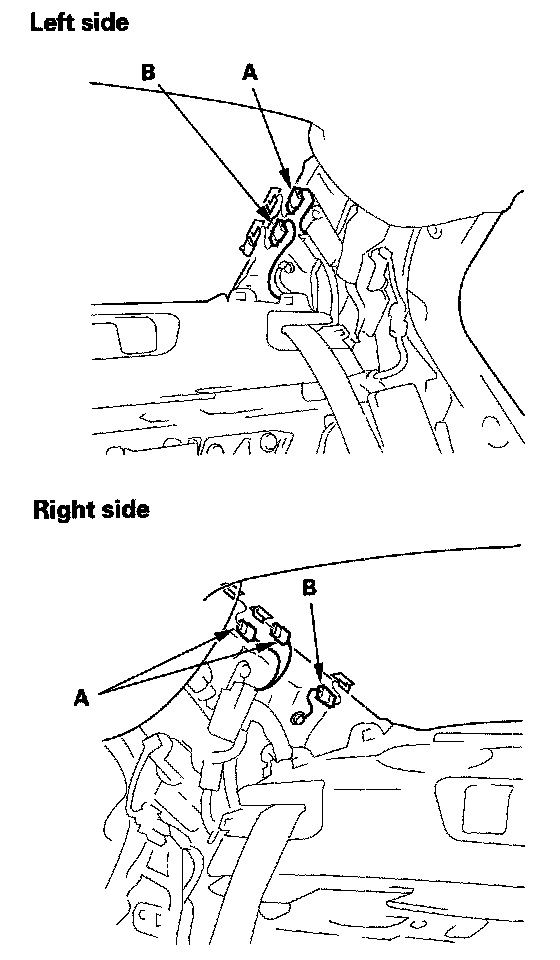 4. Pull down the rear portion of the headliner (A) by detaching the clips (B). Take care not to bend the headliner excessively, or you may crease or break it.