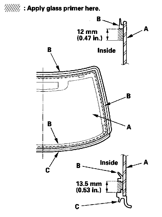 17. With a sponge, apply a light coat of glass primer along the edge of the rear window (A) between the dam B (B) and dam C (C) as shown, then lightly wipe it off with gauze or cheesecloth: