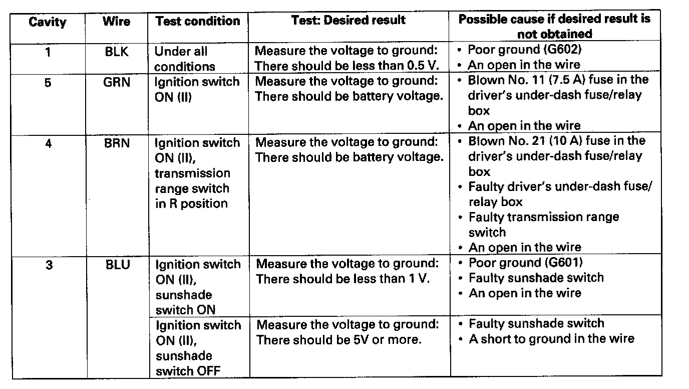 - If all the input tests prove OK, the control unit must be faulty; replace the power rear window sunshade.