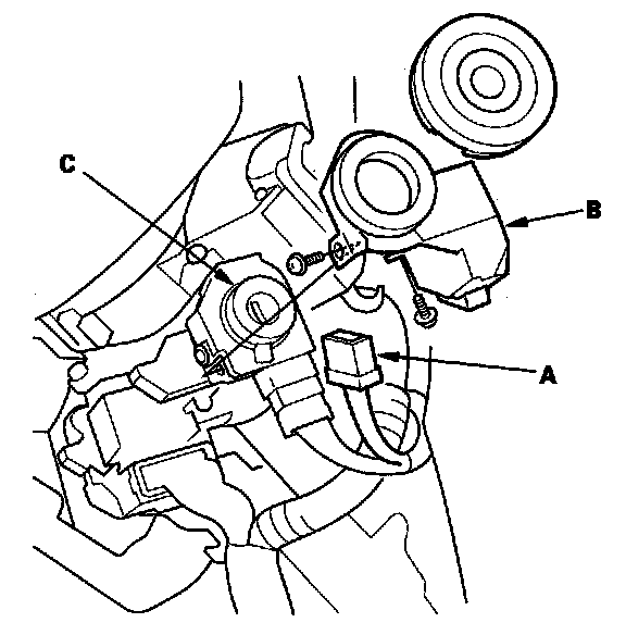4. Remove the two screws and the immobilizer control unit-receiver from the ignition key cylinder (C).
