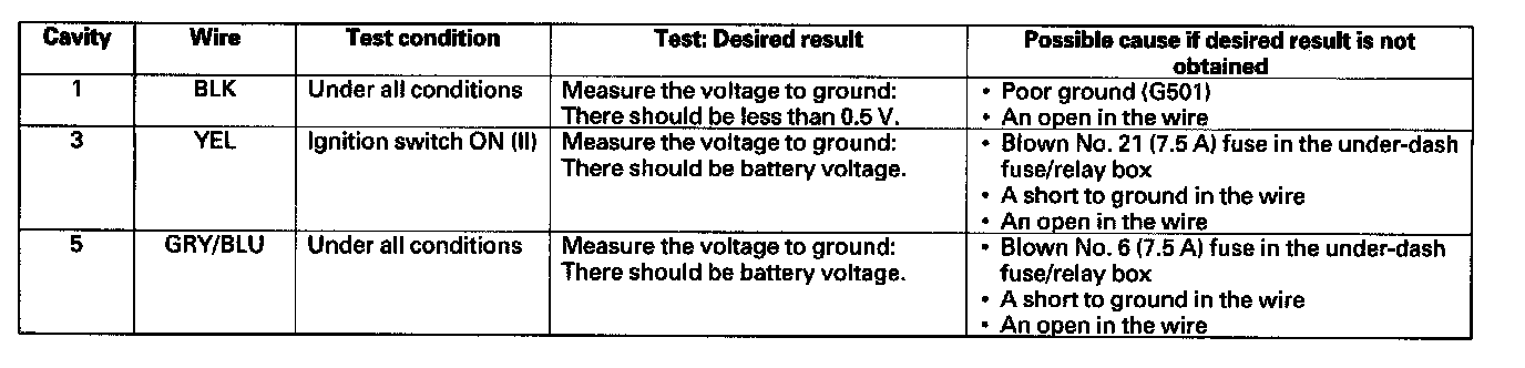 5. Reconnect the connector, and make these input tests at the connector.