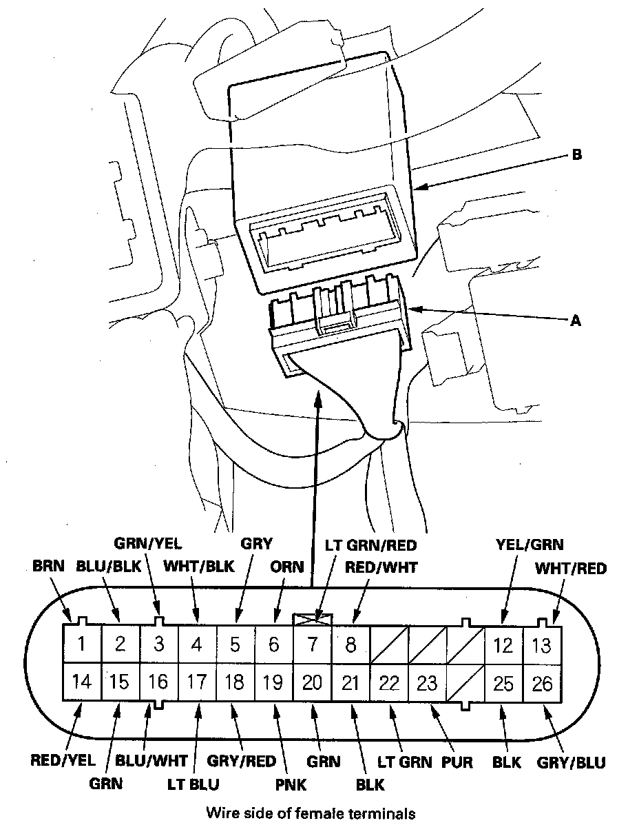 3. Disconnect the 26P connector (A) from the power mirror control unit (B).