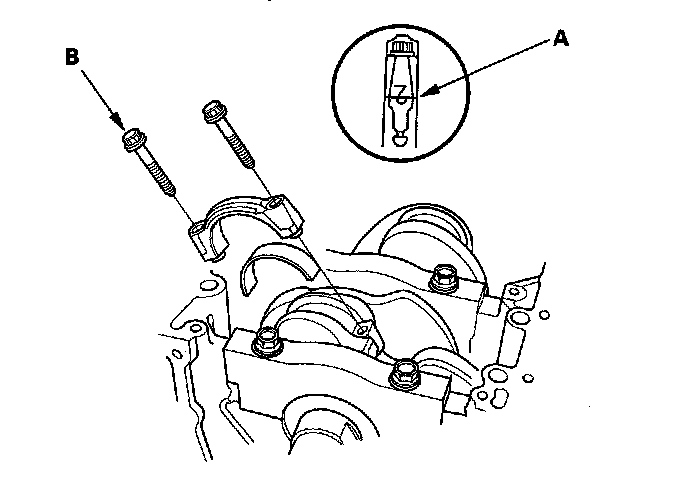 7. Install the bearings (A) and bearing caps (B) with the arrow (C) facing the timing belt end of the engine.