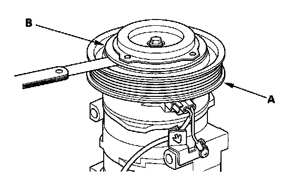 3. Measure the clearance between the rotor pulley (A) and the pressure plate (B) all the way around. If the clearance is not within specified limits, remove the pressure plate and add or remove shims as needed to increase or decrease clearance.