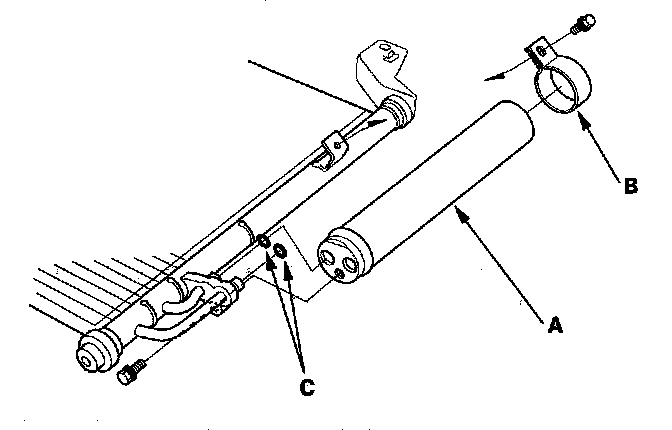 2. Remove the bolts from the A/C condenser, then remove the receiver/dryer (A), the bracket (B) and the O-rings (C).