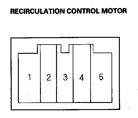 2. Connect battery power to the No. 5 terminal of the recirculation control motor, and ground the No. 1 and No. 2 terminals; the recirculation control motor should run smoothly. To avoid damaging the recirculation control motor, do not reverse power and ground. Disconnect the No. 1 or No. 2 terminals from ground; the recirculation control motor should stop at Fresh (when the No. 1 terminal is disconnected) or Recirculate (when the No. 2 terminal is disconnected). Don't cycle the recirculation control motor for a long time.