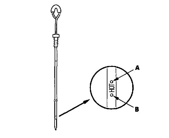 5. Remove the dipstick and check the fluid level. It should be between the upper mark (A) and the lower mark (B).