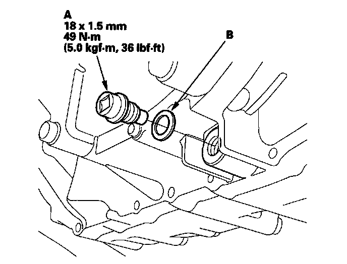 5. Reinstall the drain plug and a new sealing washer (B).