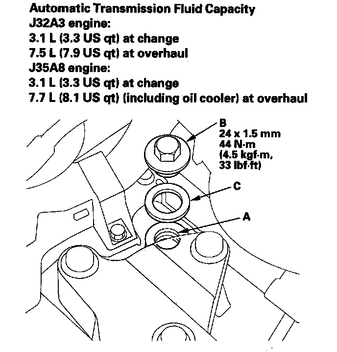 8. Install the ATF filler bolt (B) with a new sealing washer (C).