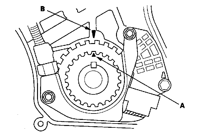 2. Set the timing belt drive pulley to top dead center (TDC) by aligning the TDC mark (A) on the tooth of the timing belt drive pulley with the pointer (B) on the oil pump.