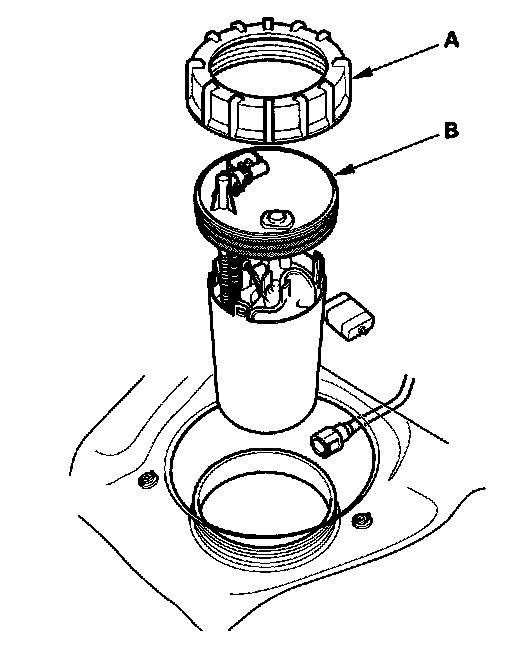 8. Remove the locknut (A) and the fuel tank unit (B).