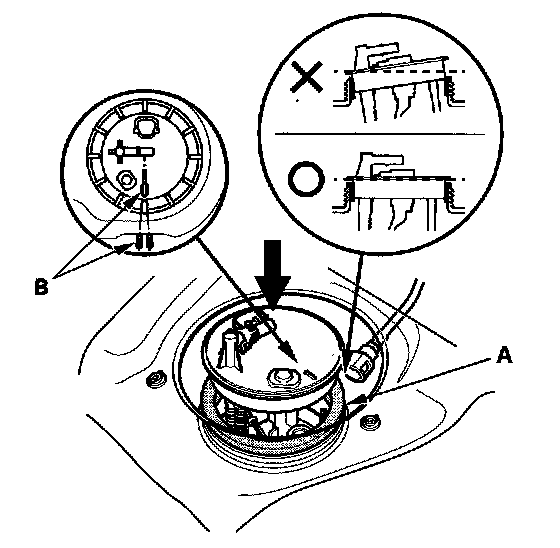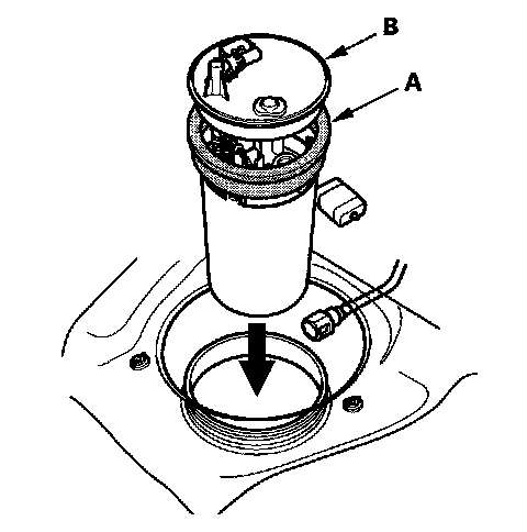 1. Temporarily attach a new base gasket (A) to the fuel tank unit (B), then insert the fuel tank unit partially into the fuel tank.